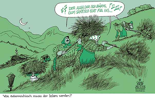 Oliver Schopf, politischer Karikaturist aus Österreich, politische Karikaturen, Illustrationen Archiv politische Karikatur Asylrecht Migration in Österreich  2014 ISLAM OESTERREICH ISLAMGESETZ GENERALVERDACHT BERGBAUERN GEBIRGE HEUERNTE ALLAH GRUEN HALBMOND