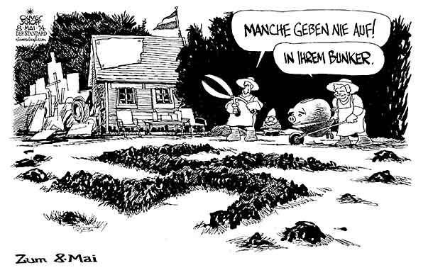 Oliver Schopf, politischer Karikaturist aus Österreich, politische Karikaturen aus Österreich, Karikatur Cartoon Illustrationen Politik Politiker Österreich 2014: WELTKRIEG II KAPITULATION 8 MAI 1945 SCHREBERGARTEN FAYMANN SPINDELEGGER GAERTNER MAULWURF HUEGEL NAZI HAKENKREUZ