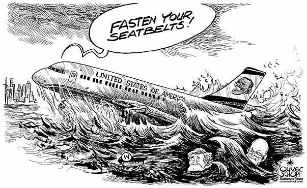 Oliver Schopf, editorial cartoons from Austria, cartoonist from Austria, Austrian illustrations, illustrator from Austria, editorial cartoon president of the united states of amerika usa barack obama 2009: george w. bush, cheney, airplane, Hudson river, departure, seatbelts