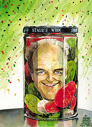 Oliver Schopf, editorial cartoons from Austria, cartoonist from Austria, Austrian illustrations, illustrator from Austria, editorial cartoon portrait economy: hans staud, aquarell, portraet, staud’s wien, delikatessen, gurkenglas, marmelade